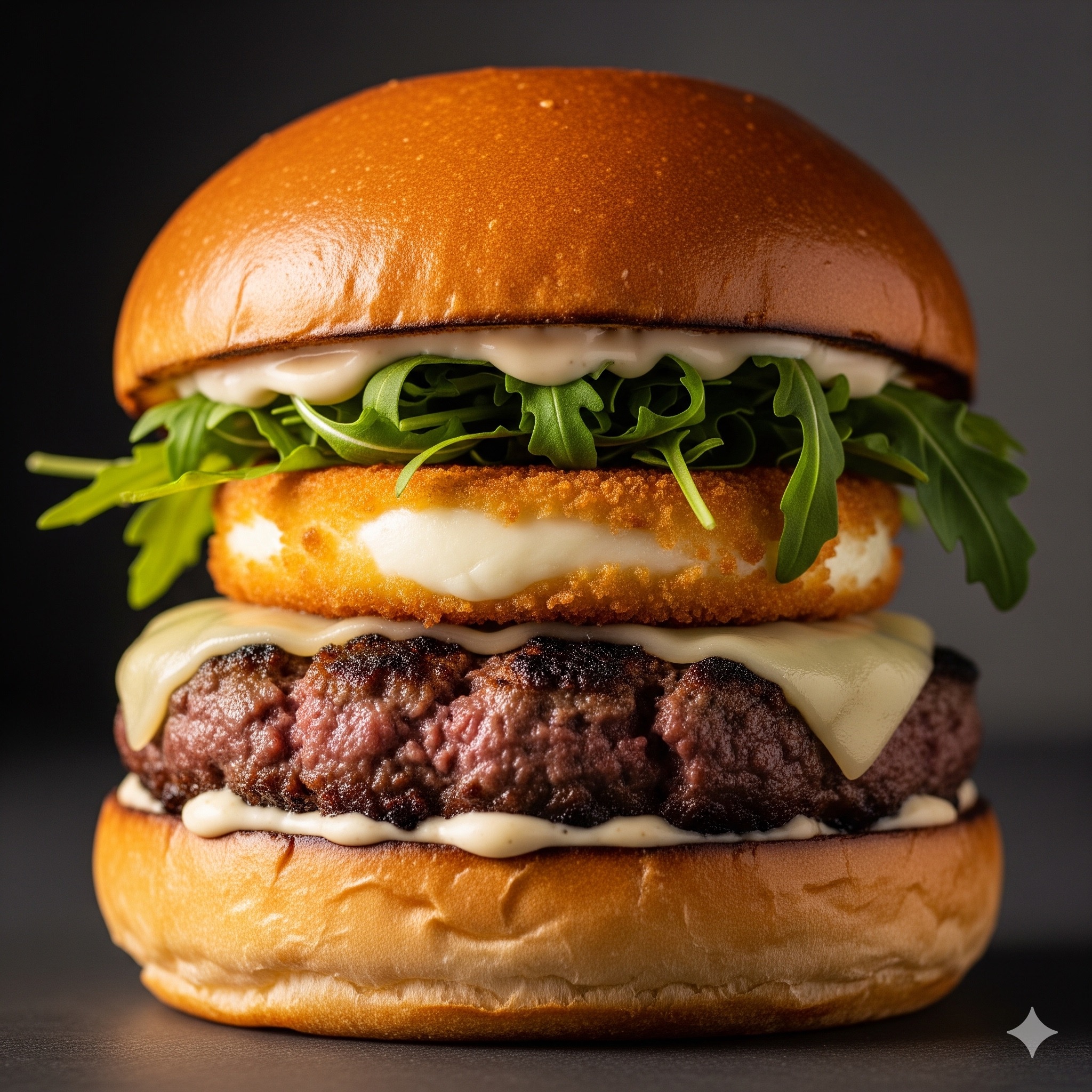Pão brioche com hambúrguer artesanal de 150g, queijo muçarela empanado, rúcula e maionese especial.