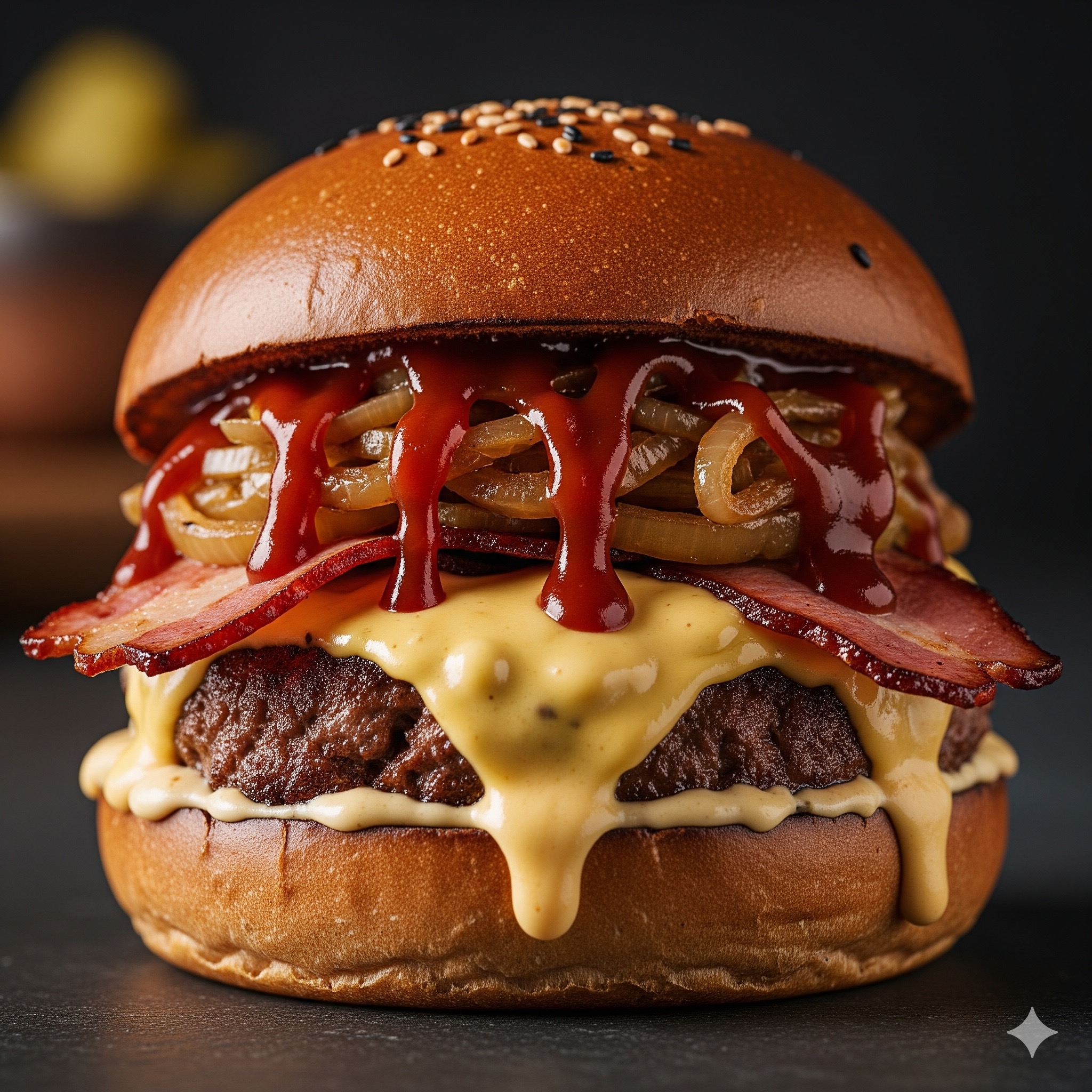 Pão australiano recheado com 2 hambúrgueres de 150g, cheddar cremoso, bacon, cebola caramelizada e molho barbecue.