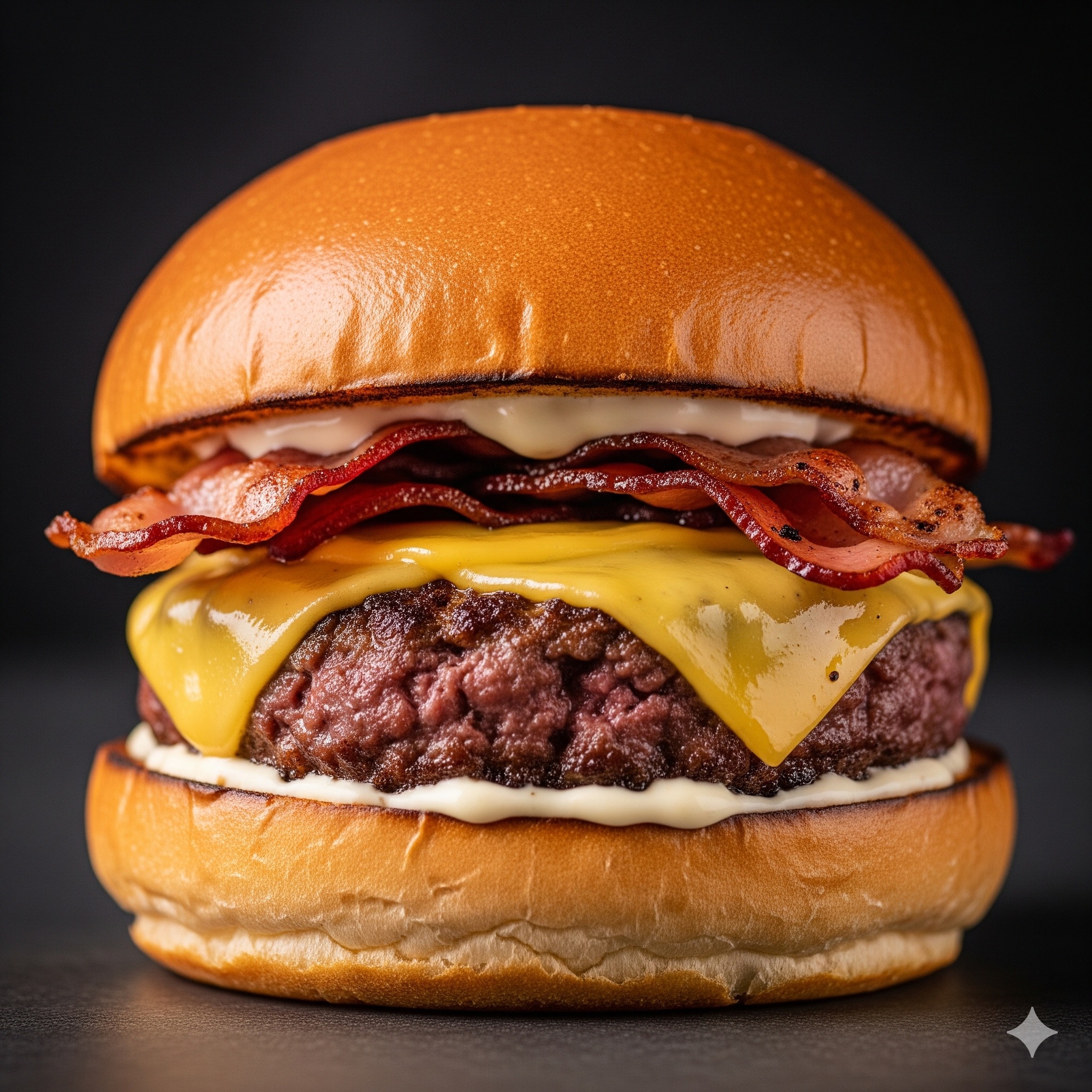 Pão brioche , hambúrguer artesanal de 150g, queijo prato, bacon crocante e maionese especial.