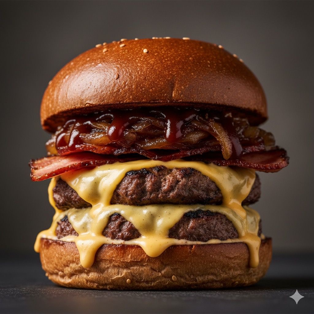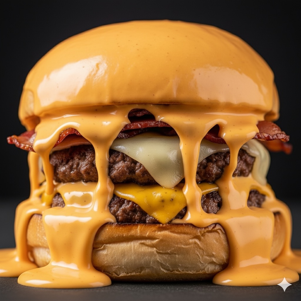 Pão brioche com 2 hambúrgueres artesanais de 150g, queijo prato, bacon, maionese especial e um Tsunami de Cheddar