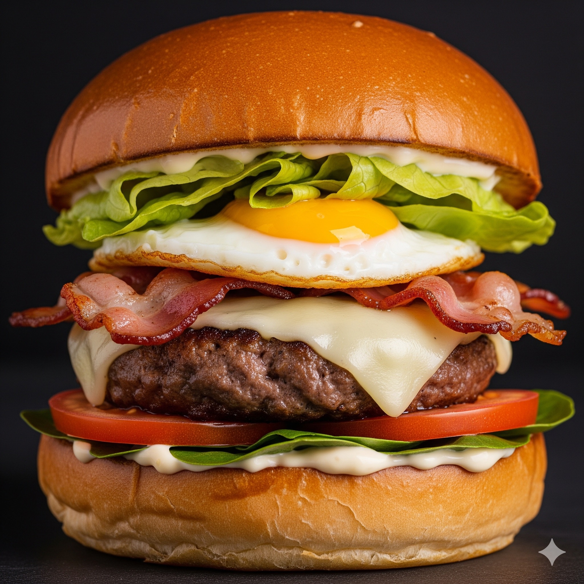 ão brioche, hambúrguer artesanal de 150g, queijo prato , bacon crocante, ovo frito, alface americana, fatias de tomate italiano e maionese da casa.